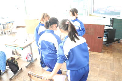 外国語の授業では、「Can you ~ ?」とその答え方について学習しました。教科担任の先生から説明を聞いて、各自でその答えを考えてノートに書きました。わからないときは、ALTに聞いたり、調べたりしながらノートに書いてから発表しました。