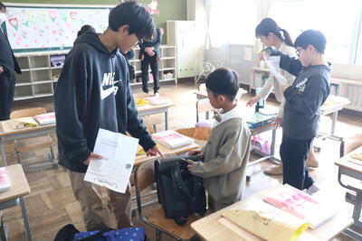 6年生が教室まで連れて行ってくれました!そして身の回りのことを優しく手伝ってくれました。最上級生として1年生の面倒を明日からよろしくお願いします。