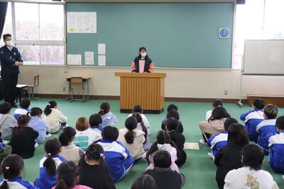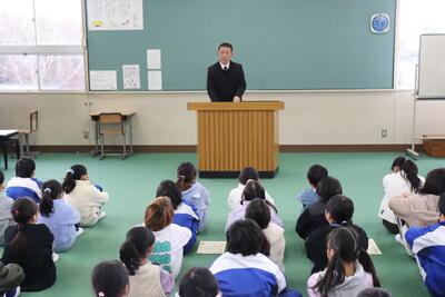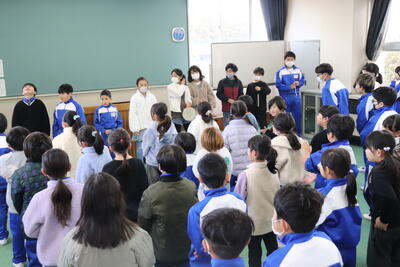 校歌を元気よく歌いました。校長先生のお話で、「1年の計は元旦にあり、今年1年を振返って新年の目標を立ててください。」というお話がありました。生徒指導から「”しゃ”に注意」ということで、自動車(事故)、救急車(怪我)、消防自動車(火事)、不審者等に気を付けて周りの人への感謝する話がありました。養護教諭からは、感染症と規則正しい生活についてお話がありました。全体的によく話を聞いていたのがとても印象に残りました。クリスマスやお正月を楽しく過ごして、1月6日元気に登校してくることを願っています。よいお年をお迎えください。