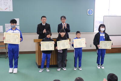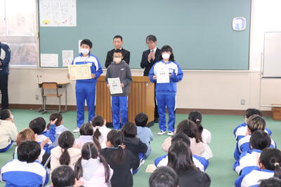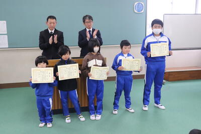 集会の前にクリスマスソングを歌いました。その後、前回の表彰式の続きとして次の内容について賞状伝達を行いました。①千葉県児童・生徒教職員科学作品展科学論文の部入選1名、郡市図工美術児童・生徒作品展入選5名、県展2名②税に関する絵はがきコンクール佳作1名③郡市陸上競技大会男子ボールスロー8位、敢闘賞男子1名、女子1名 です。おめでとうございます。