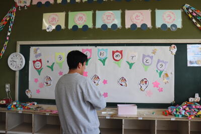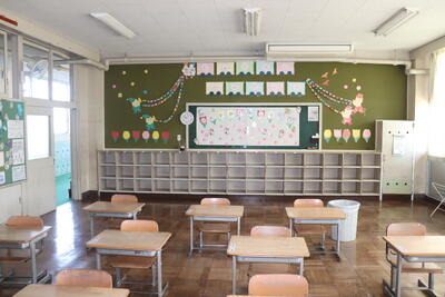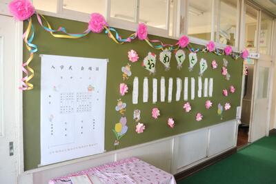 9日(木)の入学式に向けて1年生教室の装飾を職員で行いました。内側の壁には、昨年の1年生(新年度2年生)が描いた学校行事等の絵が飾られています。正面や背面の黒板、廊下側の壁には、「こいちごまる」や「花飾り」、「新入生へのメッセージ」等を飾っていました。7日(火)の着任式・始業式のあと、全校児童で新入生を温かく迎えたいと思います。