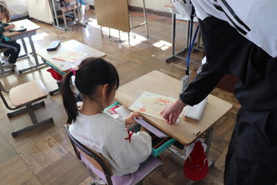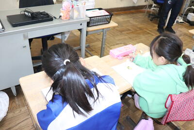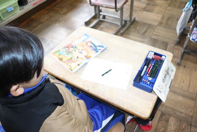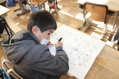 生活科の授業では、「郵便の仕組みを学ぶ」や「感謝の気持ちを伝える体験」等の観点から年賀状を書きました。この後、校外学習を兼ねて近くの郵便局に年賀状を出しに行きました。