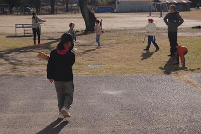 体育の授業では、「ベースボール型」の授業を行いました。ティーを使ってバットでボール(やわらかいもの)を打ち、それを守備側が捕球したところに集まるまでに打者が進んだベースの数を点数とした内容でゲームを行いました。