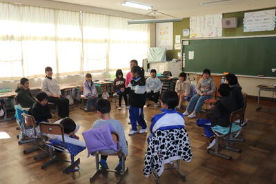 国語の授業では、「天にのぼったおけやさん」という題材の授業を行いました。担任の先生が用意してくれた大きな風呂敷等を使って、実際に体験しながらあらすじを聞きました。臨場感あふれる授業で、昔の話でしたが十分楽しさを味わえました。