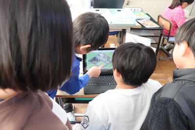 国語の授業では、クラス(学校)の「不思議図鑑」を作成しました。各自で学校に関するテーマを決めて調べ、タブレットで撮った画像を貼り付けたり、文章を打ち込んだりしました。図鑑の完成が楽しみです。
