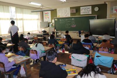 学級活動の時間では、「クラスの人あてクイズ」を行いました。各自で自分についてのヒントを書いた紙を担任の先生に渡して、そのヒントを先生が読み上げ、児童を当てるものでした。全問正解者が3人くらいいたそうです。(クラスメートのことがよくわかっていてすごいですね)