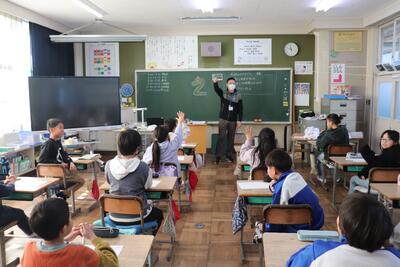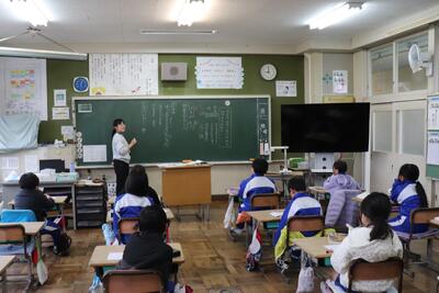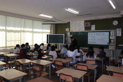 外国語の授業では、英語のヒントから千葉県内にある施設をあてるクイズに挑戦していました。児童は、積極的に手を挙げて発表していました。東京ディズニーリゾートや成田空港などがあり、ほとんど正解することができました。(答えも英語で答えていました)
