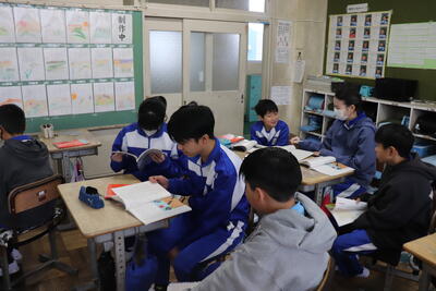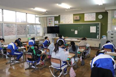 学級活動の時間では、提出物の確認をしました。次の外国語の授業では、授業の冒頭に冬休みで印象に残ったことを発表しました。(日本語)その後、「スリーヒントクイズ」ということで英語で書かれた3つの言葉から都道府県を当てるクイズに挑戦しました。(答えに千葉県や静岡県等がありました)