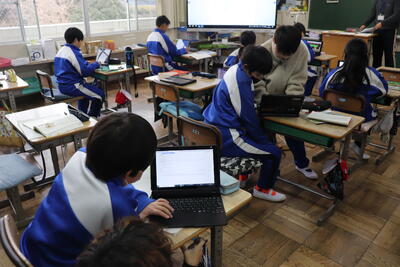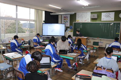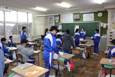 外国語の授業では、「英語で交流しよう」ということで、隣の小学校と英語で対話をしました。以前、オーストラリアの児童と行ったことがあるので、対話はスムーズにすすみました。終わったら、振り返りとしてタブレットに感想を打ち込みました。外国語(英語)の授業での交流でしたが、4月からは小見川中学校で一緒に生活する仲間なので、よい機会となりました。