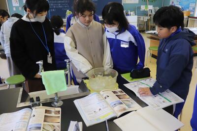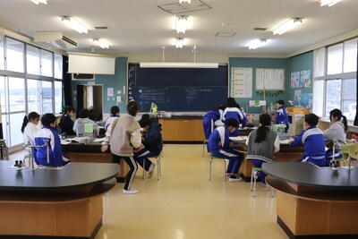 理科の授業では、理科室で実験を行いました。内容は、水に溶かした「食塩」と「ミョウバン」を氷で冷やすことで現れる結晶等を観察しました。教科書に載っている結晶と同じものが現れ、それをしっかりと記録していました。