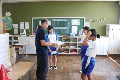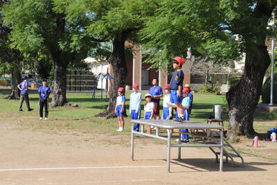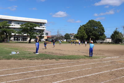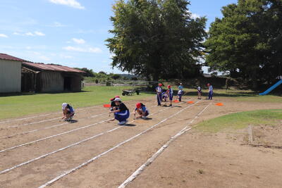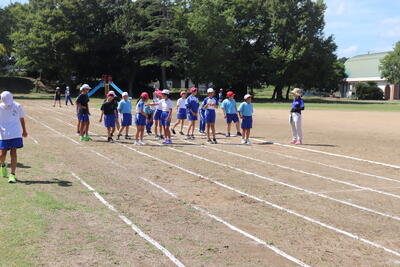 6年生によるグラウンド整備の様子です。直線の80mコースを中心に草を取って集めてくれました。すすんで活動する姿勢は立派です。さすが若鯉のリーダーだと思いました。その隣では学年ごとに決められた時間にグラウンドに出て、各競技の動きを実際に確認していました。徒競走はもちろんのこと、学年種目の入退場や開会式で歌う校歌の練習等、本番に向けていよいよ本格的に始動しました。