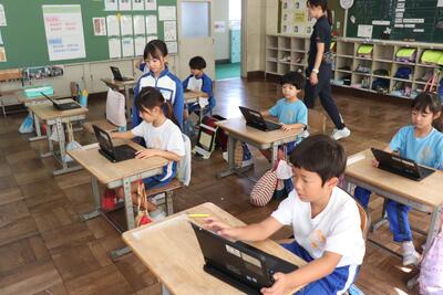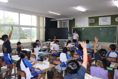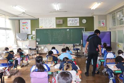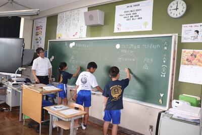 算数の授業では、文章問題に挑戦していました。教頭先生から「問題を解ける人は?」と投げかけがあると、積極的に手を挙げて黒板の問題を解いていました。式を立ててから答えを導き、最終的には単位をつけるところまで行っていました。