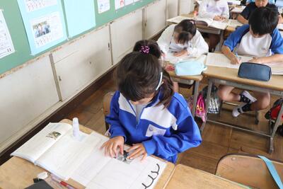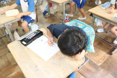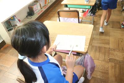 2年生は朝の時間にプリントを使って視写(となりの作文を見てそのまま写す)を行っていました。これは、集中して文字を読みとり、正確に写しながら書き込む力をつけるためのものです。児童は集中して取り組んでいました。