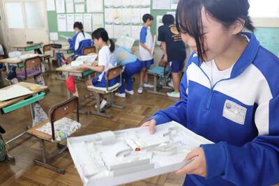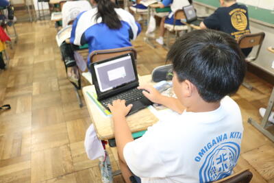 理科の授業では、銚子市にある「屛風ヶ浦」について学習しました。初めに映像を見てから疑問点について、タブレットで気づいたことを入力して話し合いました。波の浸食によってできたこと(海食崖)や縞模様の地層(関東ローム層も含む)等に様々なことについて理解しました。
