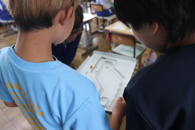 図工の授業では、厚紙をつかってビー玉の迷路を作製しました。簡単に終わるとつまらないと考え、工夫して複雑な迷路を作っていた児童が多くいました。先生も挑戦しましたが、なかなか複雑で難しく、ゴールできない迷路もありました。お互いに挑戦して楽しく取り組みました。