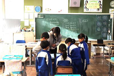 算数の授業では、「ビルをつくろう」という内容を学習しました。12個や15個の色の着いたブロックを部屋に見立てて、1階建てから5階建てまでの建物の組み合わせを考えました。積極的にタブレットのアプリを使いながら作成し、楽しく取り組んでいました。
