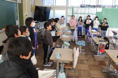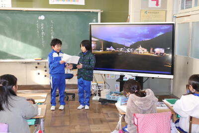 国語の授業では、「ちいきをしらべよう」の発表会を行いました。自分たちのグループで作成した資料をもとに電子黒板に映像を写しながら発表をしました。質問や感想など、頑張ってよく発表することができました。発表の様子は録画して、保護者の方に見てもらう予定です。