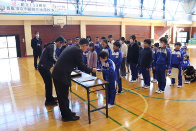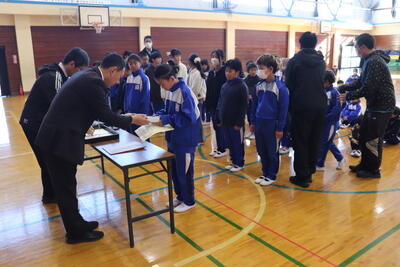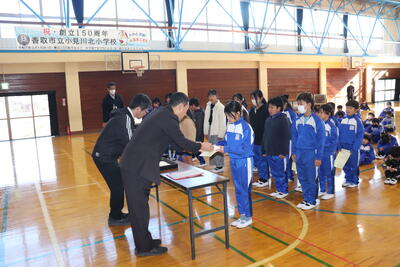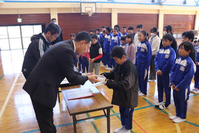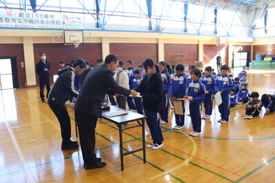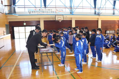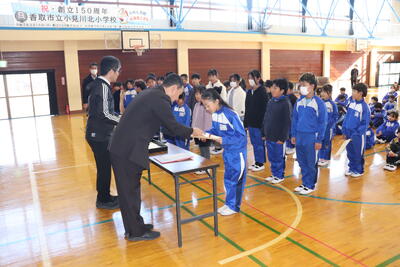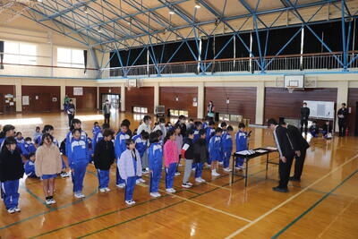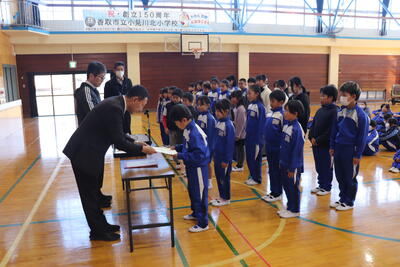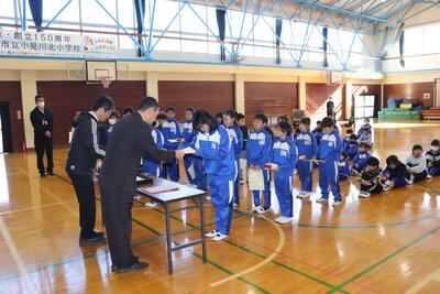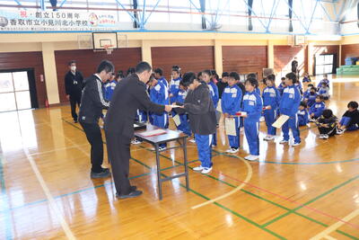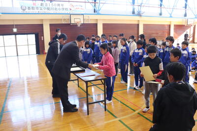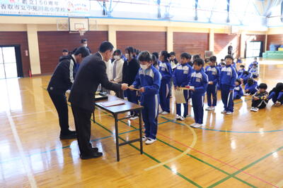 マラソン大会の閉会式が行われ、各学年男女別で入賞した児童に賞状(1位は香取神宮より盾)が授与されました。校長先生からは、「参加した全員が完走できたことや目標に向かって取り組むことの大切さ、今後も色々なことに挑戦してほしい」という話がありました。あらためて、北小児童のためにお手伝いいただいた駐在所及び安全協会の方々、応援してくださった保護者、地域の皆様に感謝いたします。ありがとうございました。