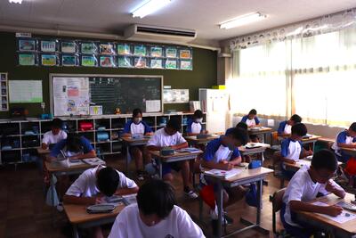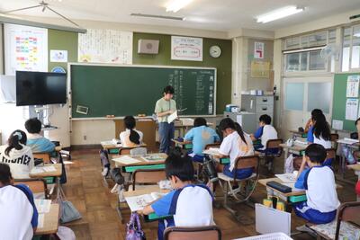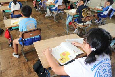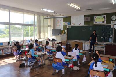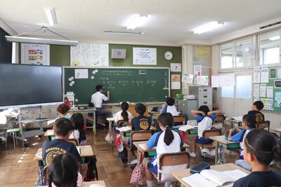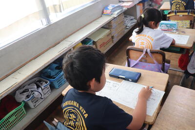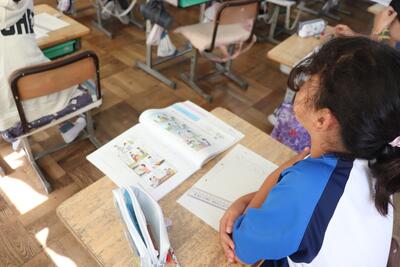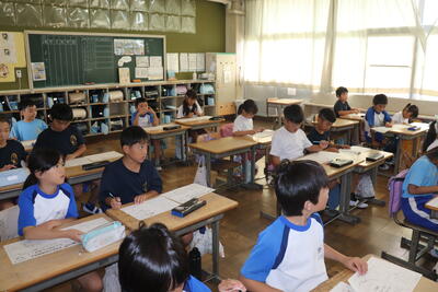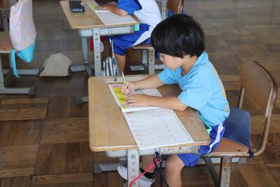 国語の授業では、単元の漢字に取り組みました。「口(くち)」と「田(た)」について学習しました。はじめに全員で書き順を指でなそり、その後ワークへ復習のために書き込みをしました。