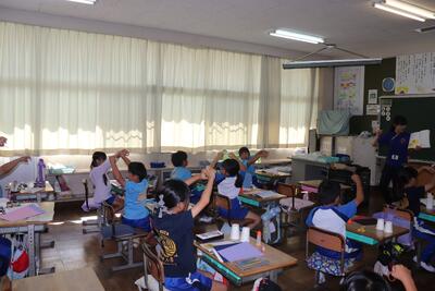 国語の授業では、教科書に出てくる紙コップを使って他の時間にロケットを作り、そのことについて詳しく説明する文章を作りました。教科書をよく読んで用意するものを準備できました。