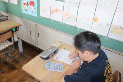 算数の授業では、これまで学習した単元プリントに取り組みました。円と正方形からできているような、いろいろな図形の面積の答えを一生懸命に解いていました。