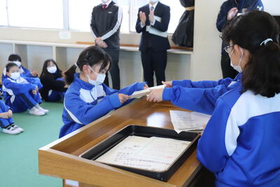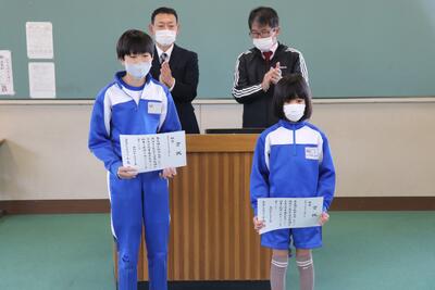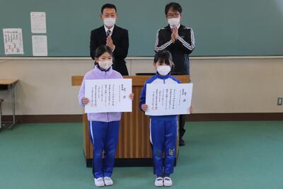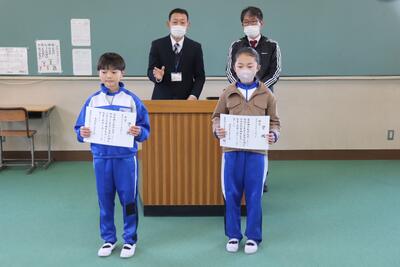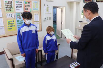 ※表彰式に欠席だったため、先日のマラソン大会で1年生と5年生で1位となった児童の伝達を校長室で行いました。