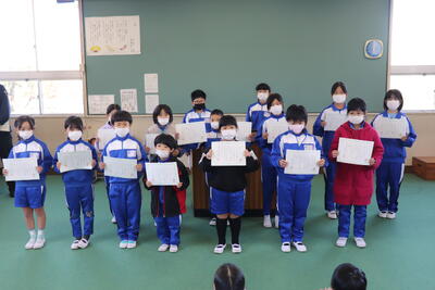 本日、なかよしタイムの時間に若鯉広場で賞状伝達が行われました。行われたのは、①郡市書写展 優秀賞2名②香取神宮展 書写の部金賞、銅賞の2名③香取神宮 図画の部 銀賞、銅賞の2名④読書賞(図書委員による伝達)の13名です。校長先生からは「今回もたくさんの人が図画や書写で賞をもらってとてもうれしいです。数が多かったので後半は、全校集会で行います。また、今回の読書賞は、合計で25名となりました。これは全校児童の4分の1です。たくさんの人が本を読んでくれてうれしいです。」というお話がありました。図画や書写は、直接各会場に行って拝見しましたが、どの児童もとても素晴らしい作品を仕上げていました。また、読書賞は、あと数冊で達成する児童もいるようなので、冬休みにぜひ多くの本を読んで欲しいと思います。冬休みは、書き初めもあります。ぜひ、積極的に取り組んで欲しいと思います。