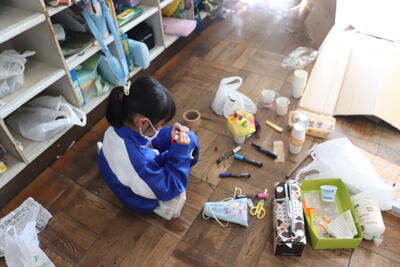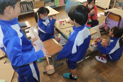 生活科の授業では、12月に近くの保育園児との交流で行う「秋まつり」のための準備を進めました。縁日のようにコーナーを作ったり、装飾品を作ったりしました。楽しく遊んでもらうためにどうしたらよいか考えながら取り組んでいました。