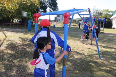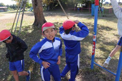 体育の授業では、ウォーミングアップでうんていに取り組んでいました。ぶらさがる動きや体を振る使い方は、この後行った鉄棒運動にとても必要なスキルなので、よい準備的動作の練習になりました。