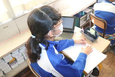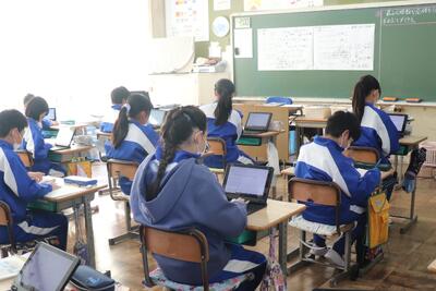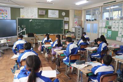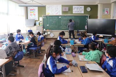 算数の授業では、舗装する距離が違う2つのものについて「最小公倍数」を用いて解く方法を学習しました。どちらも「最小公倍数」を用いますが、児童にとってわかりやすい方を考えながら解いていました。最後は、ノートにまとめてから振り返りを行いました。