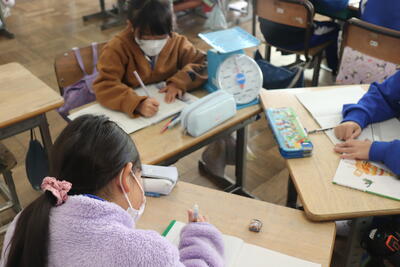 理科の授業では、「はかりを使って重さをはかる」内容を行いました。先生からはかりの使い方について説明を受けた後、実際に身近なものの重さをはかって記録しました。グループ毎によく取り組めました。