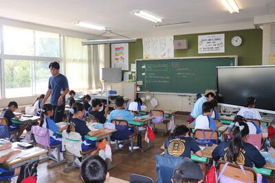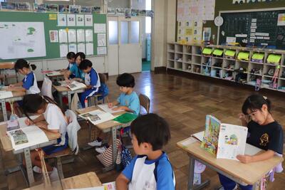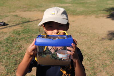 5時間目は1・2年生合同で生活科の授業でした。9月下旬の秋とはいえ、まだ日差しが強く暑い日でしたが、2年生のお兄さん、お姉さんに協力してもらって一緒にバッタやコオロギ、てんとう虫などを採取しました。