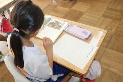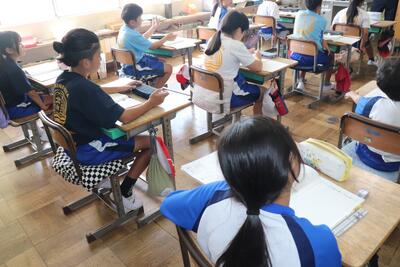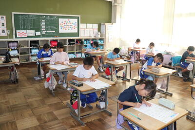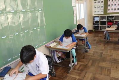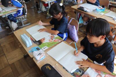 国語の授業では、授業の終わりの時間を利用して視写を行っていました。これは、教科書の決められた部分をプリントにそのまま、書き写すものです。香取市教育委員会で推奨されているもので、読み取る力をつける方法で、一生懸命取り組んでいました。(先日、2年生でも実施)
