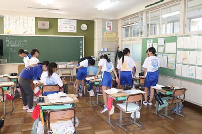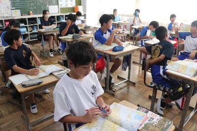 社会の授業では、歴史を学習しました。平氏と源氏の最後の戦である、「壇ノ浦の戦い」までの軌跡を地図帳を用いて確認し、平氏が西に逃げていったことや「屋島」、「壇ノ浦」の位置を地名だけでなく確認することができました。