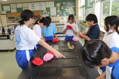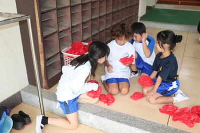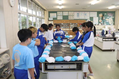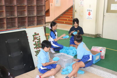 以前6年生が運んできてくれた立て看板(得点板等)に4年生と5年生が花を用意してつけてくれました。花をつけると見違えるようにきれいになりました。