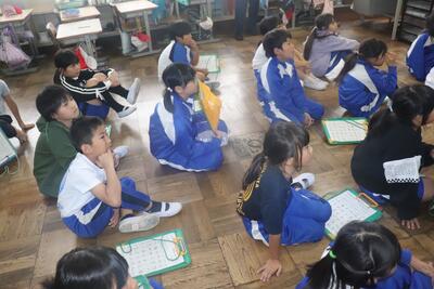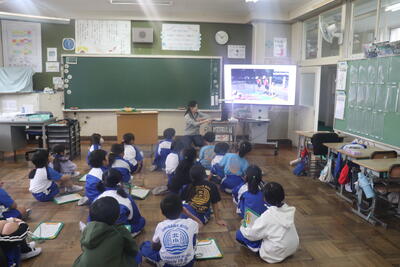 体育の授業では、1年生と2年生合同で鉄棒のオリエンテーションを行いました。鉄棒の技の種類を映像で確認したり、学習カードで確認したりしました。あいにくの雨で実際に外で行う事が出来ませんでしたが、今日見た技をもとに挑戦して欲しいと思います。