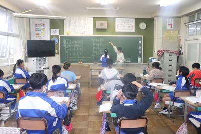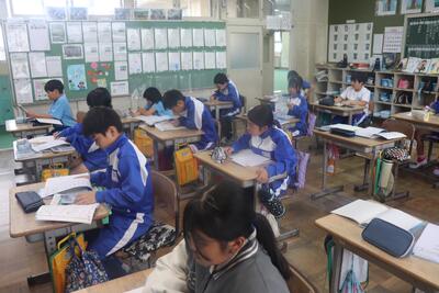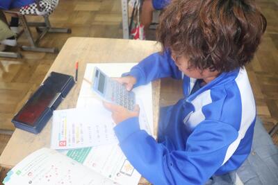 算数の授業では、四則(しそく)計算(かっこ、たす、ひく、かける、わる)の問題に取り組んでいました。計算の順番を確認しながら、複雑なところは計算機(電卓)を使いながら行いました。中学校でも学習するので、順番をしっかりと理解しておくといいですね。
