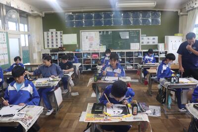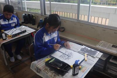 図画工作の授業では、習字道具を使って「水墨画(風)」の作品を描いていました。筆を使って輪郭や草木、山などの風景画が多く見られました。色の濃淡を使って工夫している児童も見られました。