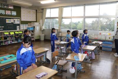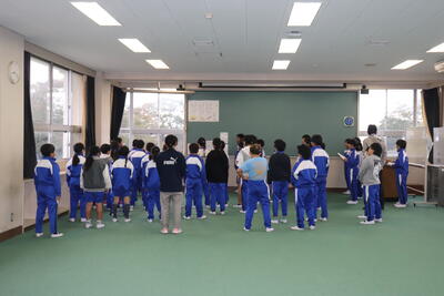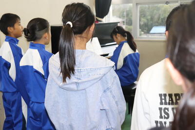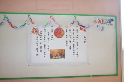 朝のがんばりタイムの時間に3階の若鯉広場で、上学年(4年生から6年生まで)が今月の歌である「もみじ」を合唱していました。伴奏は6年生児童が行い、全て自分たちですすめていました。(さすが!)