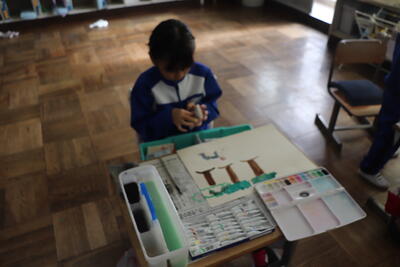 図画工作の授業では、昨日の生活科で行った小見川青少年自然の家の様子を描いていました。どんぐりや落ち葉を拾う絵が多く見られました。完成した作品は今後教室に飾られる予定です。