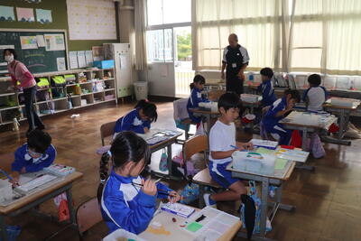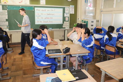 英語の授業では、センダン教室でグループ毎に分かれて英語の質問の答えのカードをかるた取りのように行っていました。手を頭の上に乗せてから「What would you like ?」と言い、ALTの先生が言う英語の単語カードを取り合っていました。楽しみながら授業に取り組んでいました。