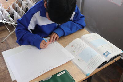 算数の授業では、「比例」の表から数直線を方眼用紙に引いていました。担任の先生からは、「表からとった個所は、ただ線を引くのではなく、しっかりと点として記入すること」というお話がありました。この後「反比例」もあります。基準となる座標点は大切になりますね。