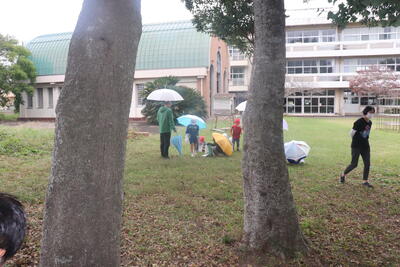 生活科の授業では、「秋をさがそう」ということで校内にある秋らしいものを集めに行きました。担任の先生の説明(安全面等)を聞いてから外に出るとポツポツと雨が降って来ました。傘を差しながらイチョウの葉やどんぐりなどを一生懸命集めていました。
