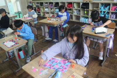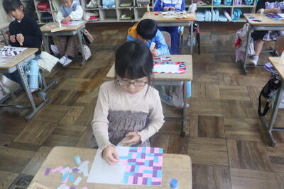 算数の授業では、今回学習した「三角形」や「長方形」等の形に切った色紙を使って模様を作りました。それぞれの児童が選んだ色と形の折り紙を上手に組み合わせながらきれいな幾何学(きかがく)的な模様の作品を仕上げていました。