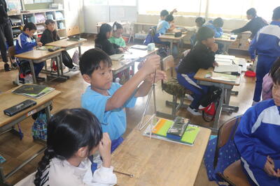 理科の授業では、「音の伝わり方」について学習しました。楽器のトライアングルを使ってグループ毎に実験を行いました。付箋(ふせん)をトライアングルの下の部分につけてたたく強弱等による変化を確認しました。