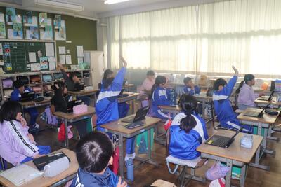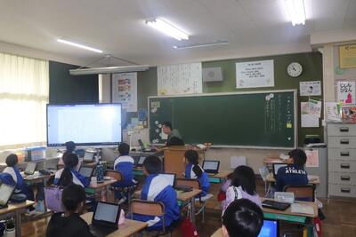 国語の授業では、「ショート、ショートの小説を書こう」ということで、タブレットのワード機能を使って小説を書き(打ち込み)ました。完成した作品の発表にあたり、始めに担任の先生がを作った話を児童に紹介していました。