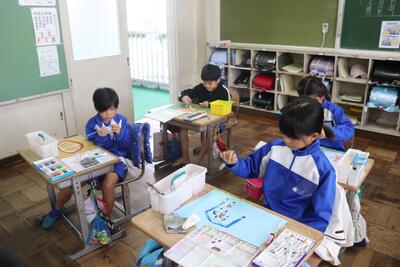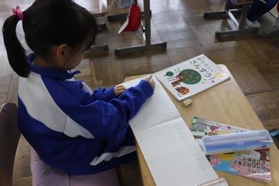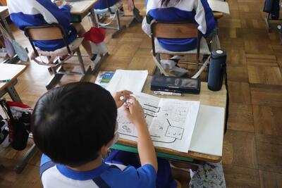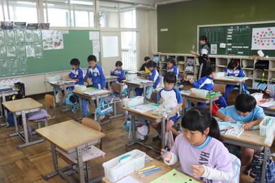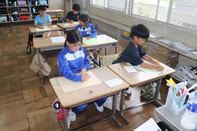 図画工作の授業では、「運動会の思い出」についての絵を描きました。下書きを見ながら実際に色画用紙に鉛筆で図を描き込んでいました。「徒競走」や「応援合戦」の絵など、自分が一番印象に残った活動の絵を丁寧に書いていました。今後、色を塗っていくのが楽しみです。