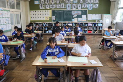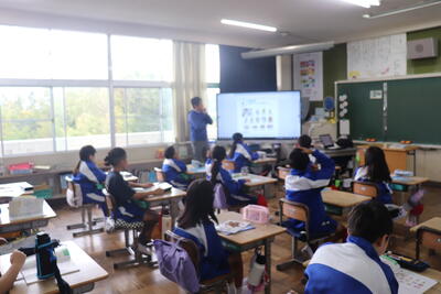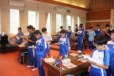 音楽の授業では、音楽堂に移動して授業を行いました。合唱では、音楽発表会で3年生と4年生が披露した「ありがとうの花」を歌いました。音楽堂での授業は、教室で行うときと一味違って合唱や演奏モードに入りやすいと思いました。