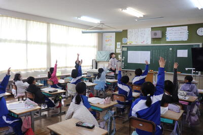 国語の授業では「文章の間違い」について学習しました。担任の先生が用意した拡大された作文用紙に書かれた文章をみながら、間違いをさがして正しい答えをみんなで共有しました。自分が見つけられなかったところがあると、「それもあったか」という素直な意見も出ました。すすんで手を挙げてとても意欲的に取り組んでいました。