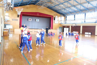 体育の授業では、「ゴール型(ハンドボール)」を行いました。今日は、簡易ゲームでパスをつなげるゲームです。ドリブルなし、シュートはゴールに見立てたマットの近くのみなので、ボールをもっていない児童の動きがポイントになりました。ゲームをやっているうちに、パスがつながりシュートまでいくことができました。